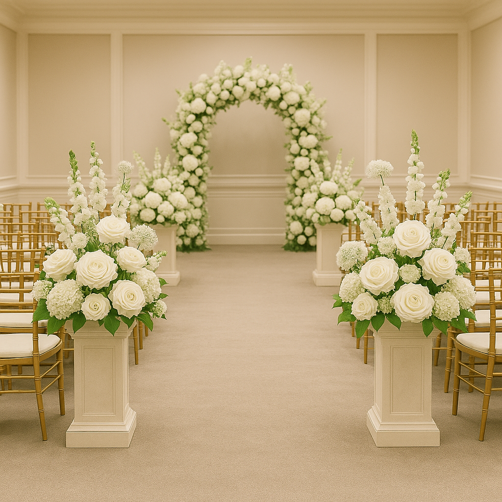 The path leading to “I do” is lined with petals that seem to echo every heartbeat. We design aisles that feel like walking through a dream—soft blossoms cascading along the walkway, vases glimmering with gentle light, and fragrances that linger in the air. Each floral detail draws the couple forward in beauty and grace, creating a moment suspended in time where nature and love meet perfectly beneath the open sky or within a candlelit hall.