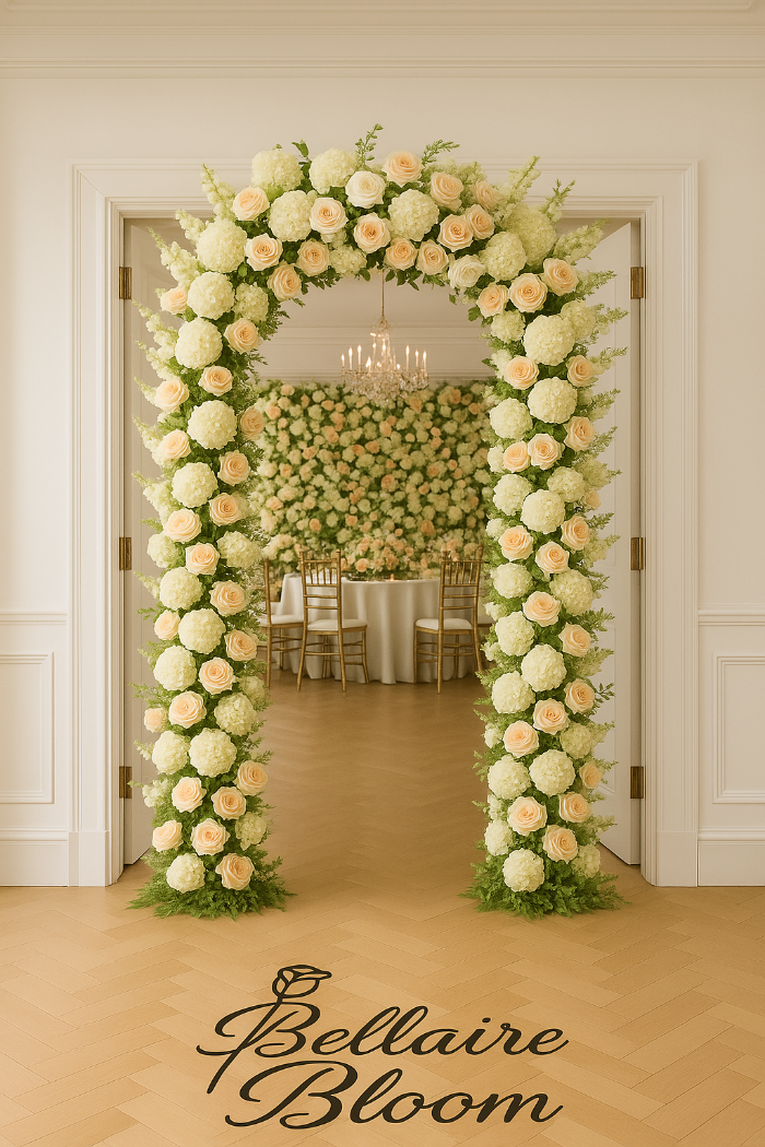 As the couple walks toward their forever, the scene unfolds beneath a Bellaire Bloom floral arch—a breathtaking gateway into a new beginning. Lush petals and cascading greenery line the aisle, surrounding each step in softness and fragrance. Every arrangement is thoughtfully designed to capture the magic of that walk, transforming the path to the altar into a living story of love framed in nature’s artistry.
