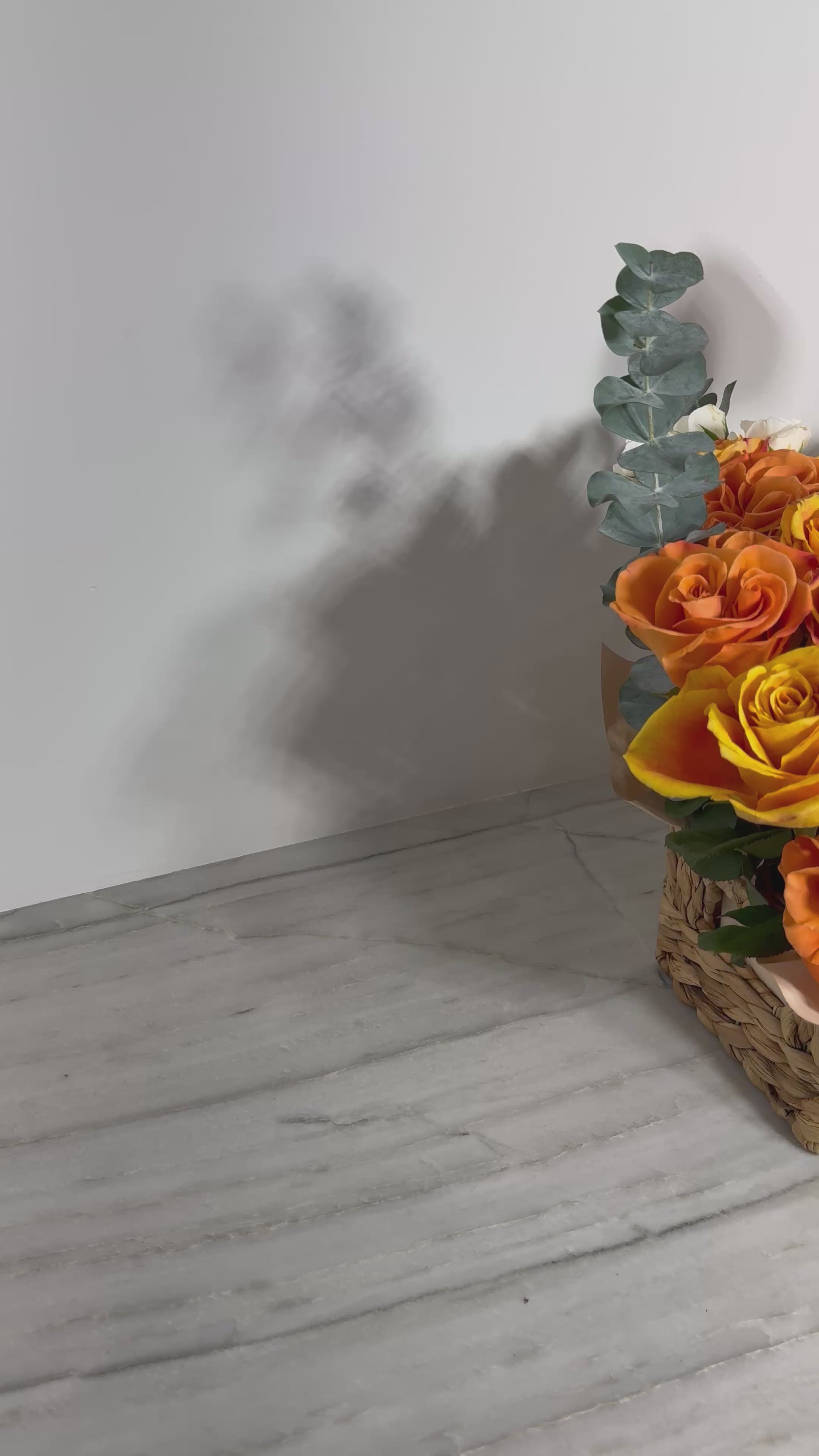 A luminous blend of fiery orange, golden yellow, and creamy white blooms, the Golden Ember Basket captures the essence of warmth and sophistication. Set in a handwoven basket and accented with soft eucalyptus sprigs, this radiant arrangement brings a touch of sunshine and elegance to any setting — a timeless expression of joy and refined beauty by Bellaire Bloom.